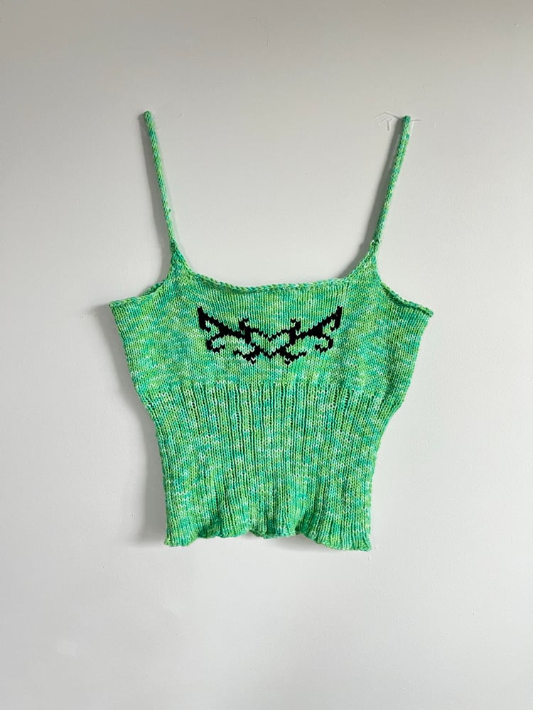 love is a winged creature tank top in multi green with design on one side. hand knit with cotton. fits XS-M